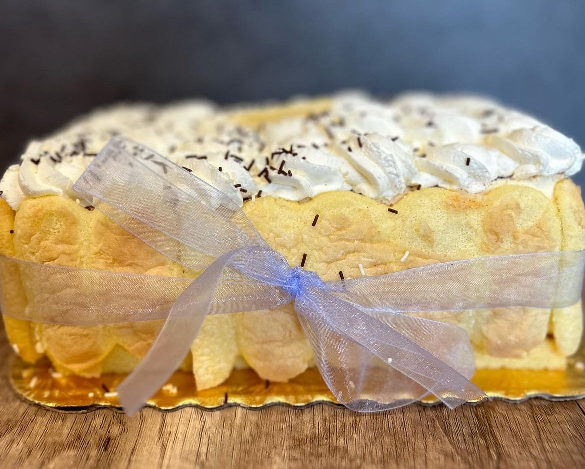 Yellow cake layers soaked in coffee syrup, marscarpone, and marsala wine mousse filling, surrounded by ladyfingers, topped with whipped cream.